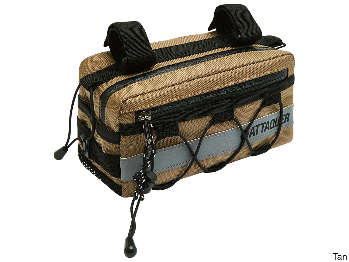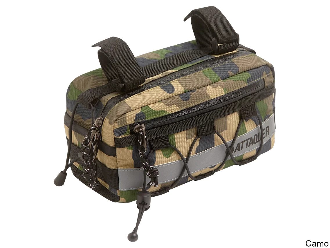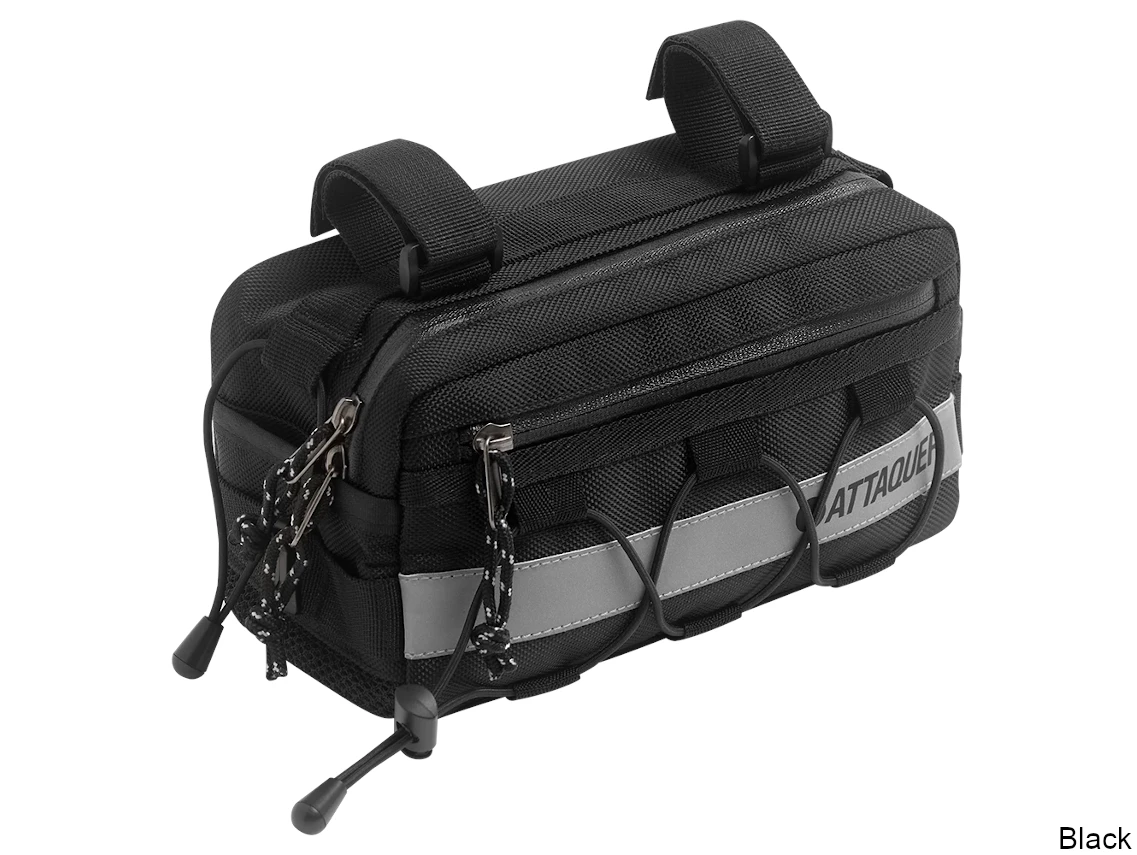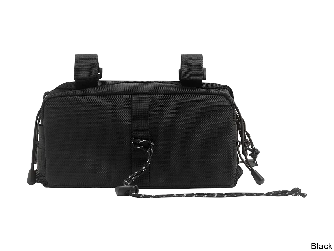 Heavy duty velcro straps are supported by a drawstring guide rope to secure the bag against your headtube and prevent rattling. Side pockets are secured with bungie straps and quick release hooks for easy access.Â