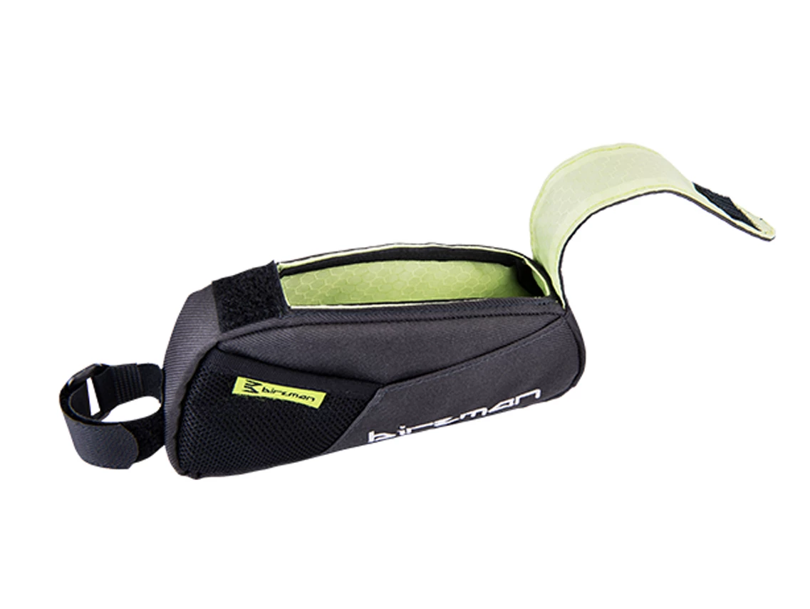 Belly R is a water repellent top tube bag with a narrow body designed to minimise contact with the thigh when pedalling.