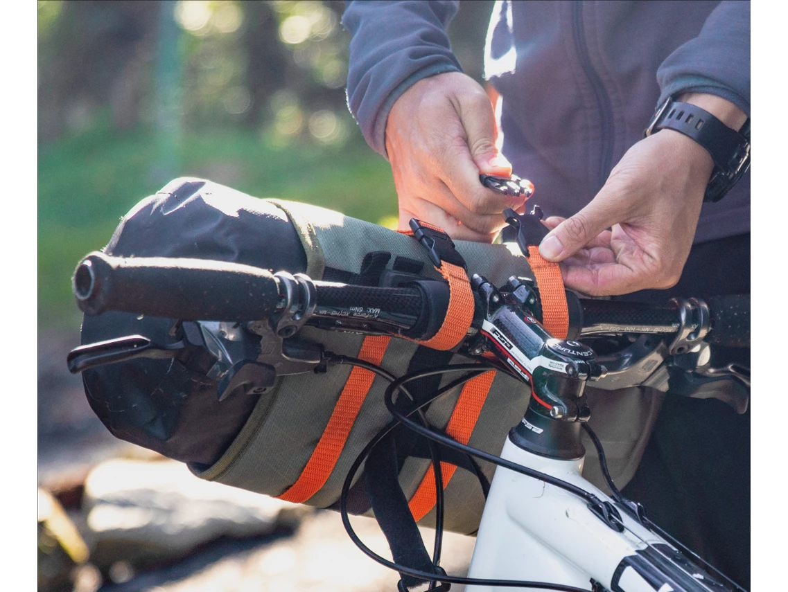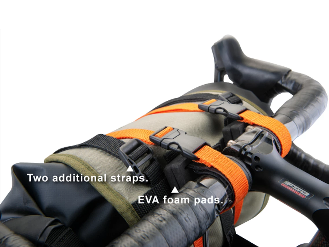 Roll-top IPX5 waterproof carrier allows for flexible capacity adjustments, and the two additional straps enable further attachment possibilities.