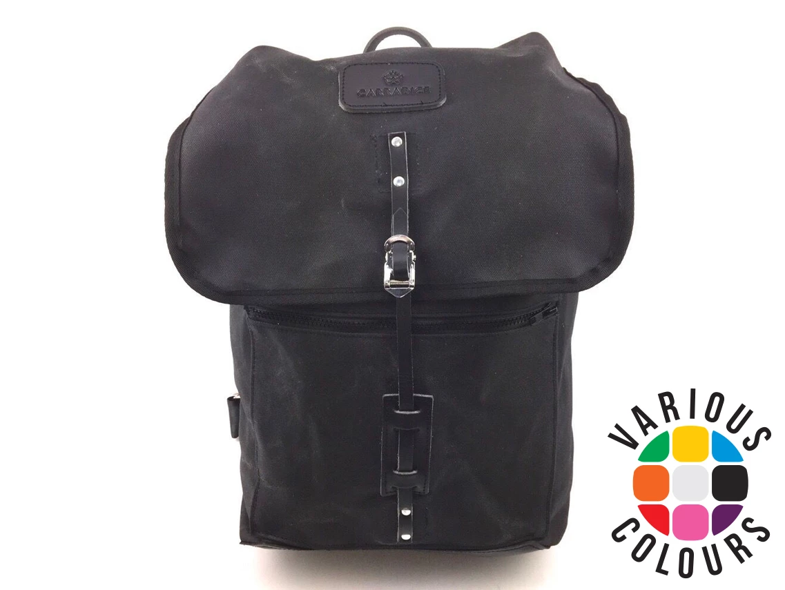 The Rydal Rucksack is their heritage inspired backpack made from their 100% waterproof MIB Vertical logo stacked Bottom North West 80cotton duck and leather.