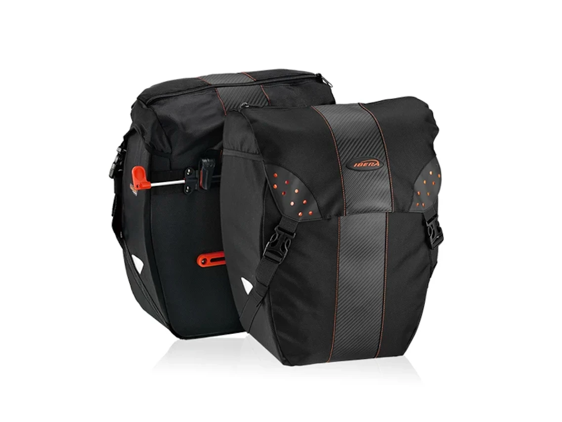 Can be used as a set or singularly. If used with Ibera PakRak Touring Carrier Plus+, other top-mounting PakRak bags can be used simultaneously. 2 large reinforced compartments, 2 side pockets, Hand-carry strap, Reflective trim.