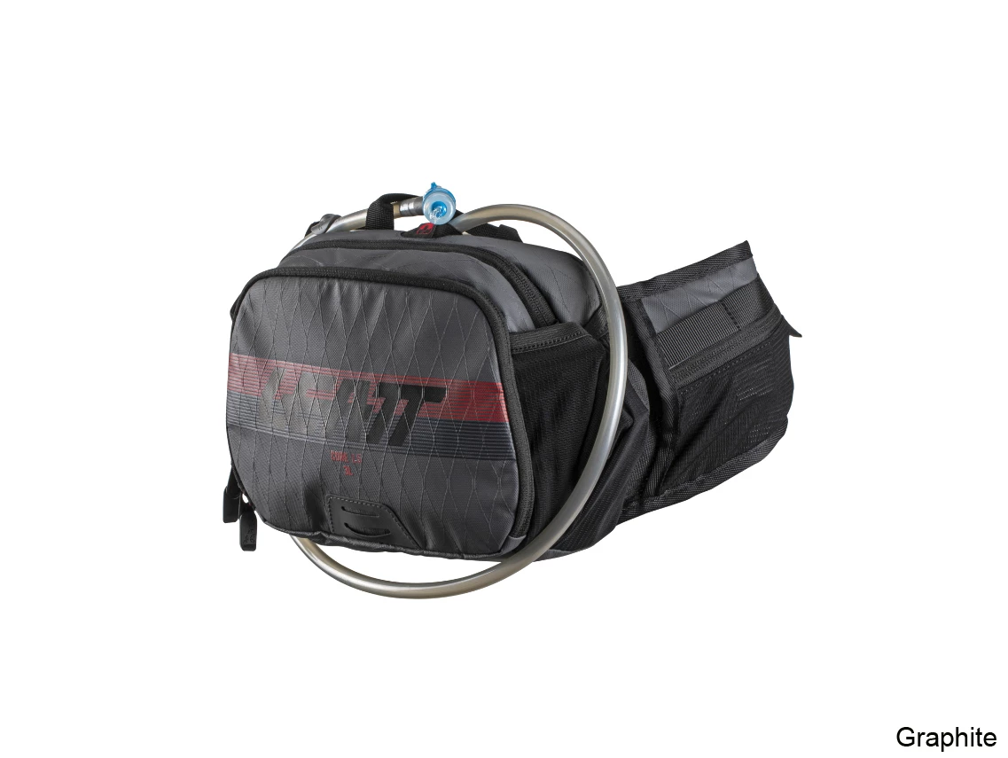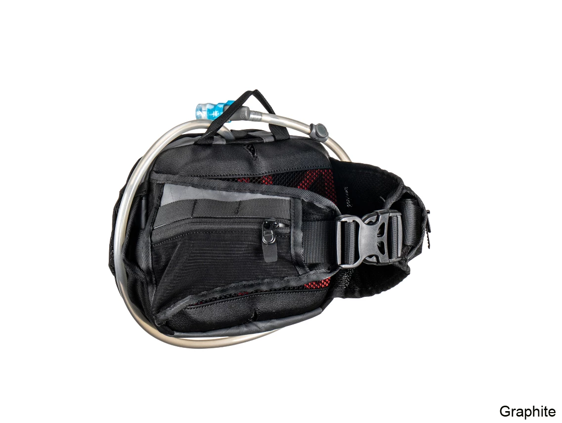 It Includes a 1.5lt bladder and bite valve, there is also a magnetic catcher that comes with the feed tube, so it stays in place. 3.lt’s of cargo storage will give you enough room for the essentials with extra pockets on the waist belt.