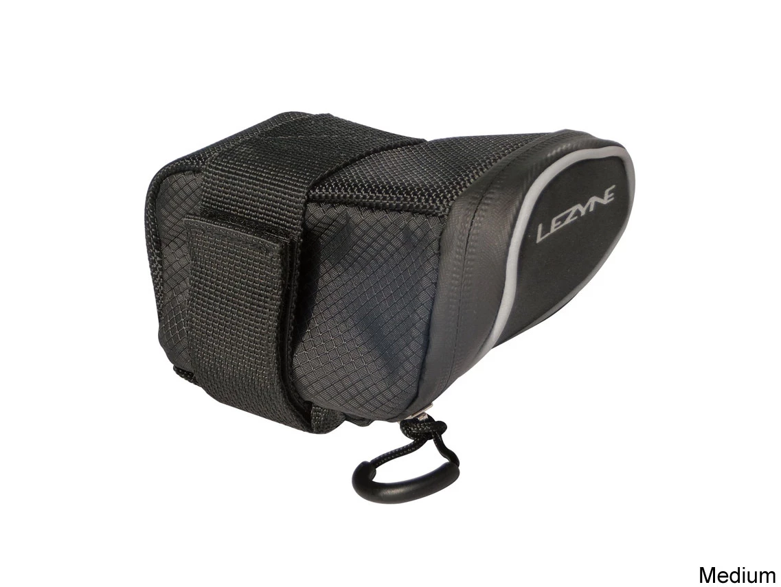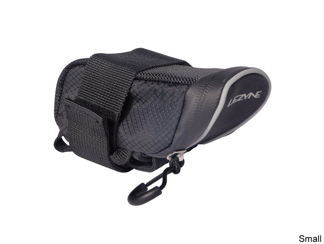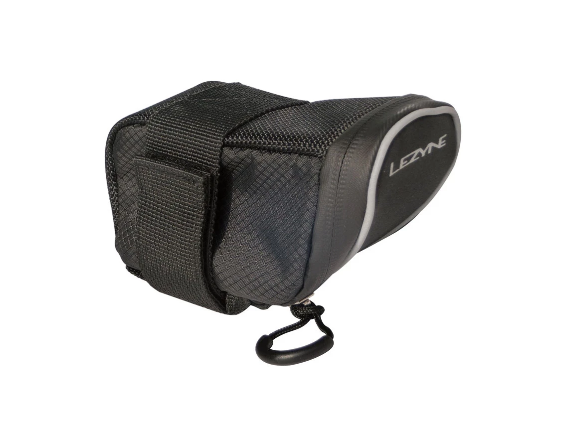 Compact, aero-shaped saddle bag. Large elastic nylon strap secures caddy to the seat rails.