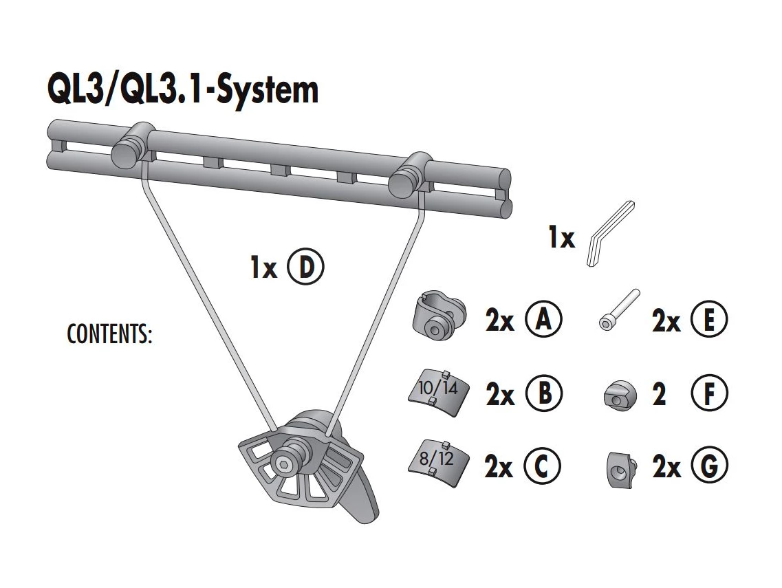 1 QL3.1 Mounting-Set, including mounting screws and inserts for bike-rack tube diameters of up to 10 mm