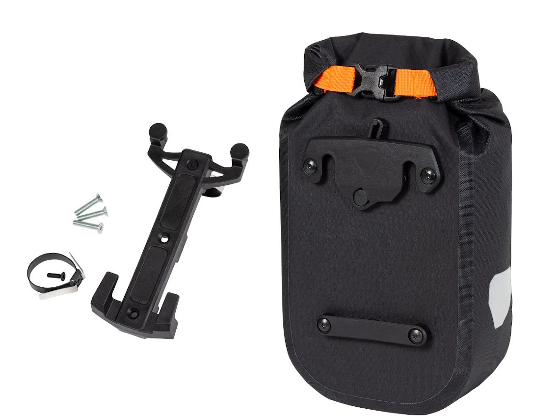 The Fork-Pack (205 grams) can easily and quickly be attached and removed from the adapter plate (85 grams) with just one hand in seconds. The nylon bag is abrasion-resistant, PVC-free and, of course, sustainably made in Germany. The maximum load is three kilograms / 6.6 lbs.