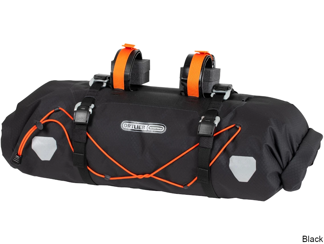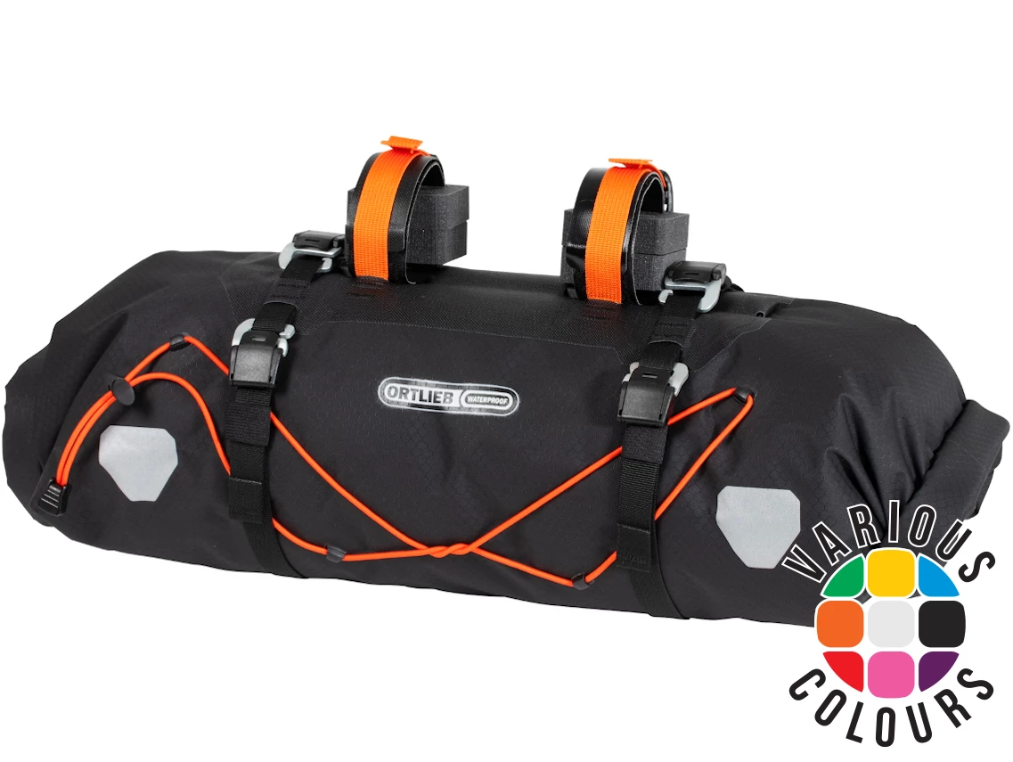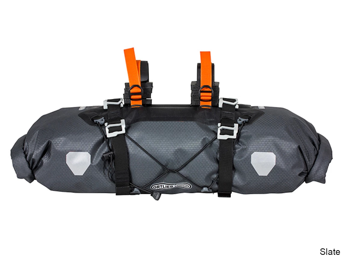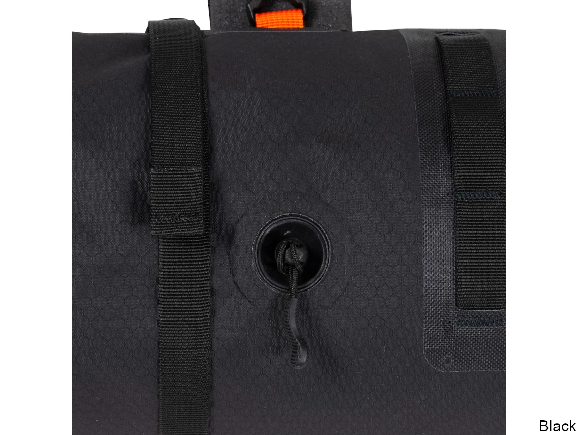 Indispensable if you’re planning to spend nights in the great outdoors while on your bikepacking tour, the Ortlieb Handlebar-Pack is a waterproof pack with 15 liters of space for your sleeping bag and sleeping pad. It also helps to ensure a balanced pack and load distribution on your bike. Thanks to the two-sided roll closures, you can easily access your stuff at any time. Compression belts and drawstrings on the outside enable you to stow and attach additional equipment. If you need extra volume, use the four hooks to attach the Accessory-Pack to the Handlebar-Pack. The mounting system, consisting of spacers and two straps with ultra-strong Velcro closures, ensures a stable attachment to any handlebar type. Integrated plastic stiffeners on the inside of the handlebar pack and an attachment fixture for the head tube provide reliable stability in any terrain.