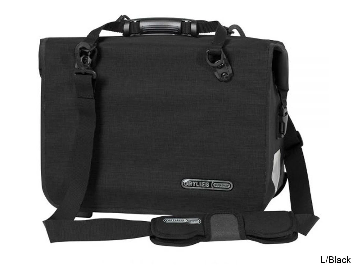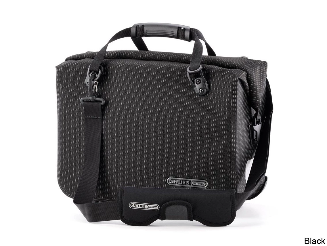 Office-Bag QL2.1 High Visibility – the bike briefcase with two faces. During daytime it presents itself in subtle elegant black matching a business suit. Once it gets dark, it turns into a highly radiant companion. The chic bike briefcase is made of PU laminated Cordura fabric with interwoven highly radiant reflective yarn. In the dark, however, not only the typical Ortlieb reflectors are visible, the whole bag is rendered into a reflector.Â