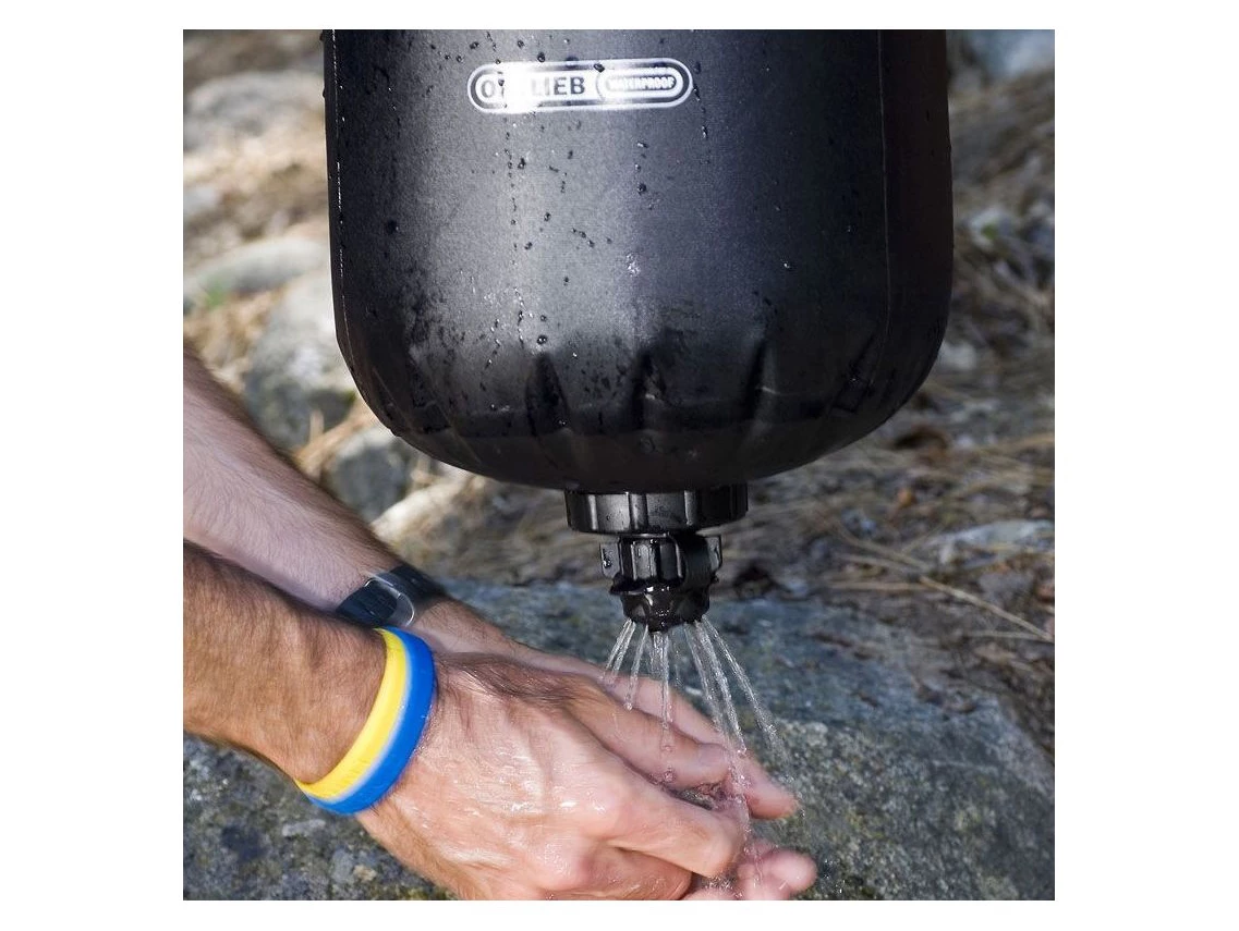 Just remove the dust cap, put on the shower valve, and open the tap. Small holes in the Ortlieb Shower Valve create a nice shower stream for constant showering. Simple metering of output is achieved by turning the shower valve to adjust water flow or turn off completely.