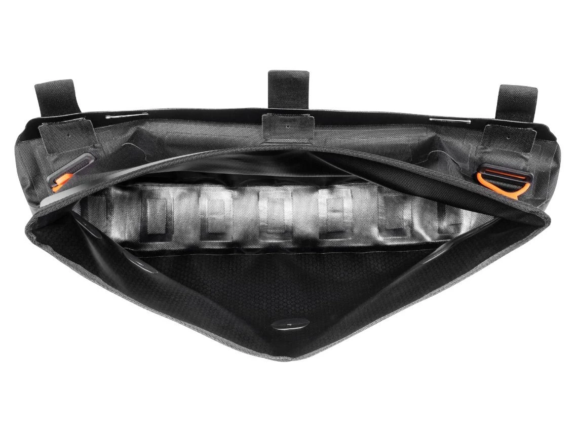 This waterproof frame bag with roll closure is also ideal for full suspension mountain bikes, where space inside the frame’s triangle is limited by the shocks.