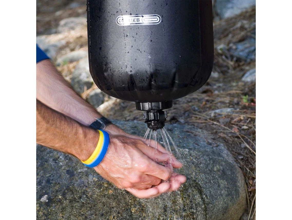 Goodbye bulky containers. The Ortlieb Water Sack ensures reliable water supply in your camp doing without big and bulky canisters. On tour the Water Sack can be packed away taking up very little space, in the camp it offers a generous 10 litres for cooking, washing or even for a shower. The large roll closure opening allows easy filling. The Water Sack is made of tear-resistant, waterproof fabric, and the integrated base valve allows easy metering. The Watersack can be combined with the purification filter by Katadyn.
