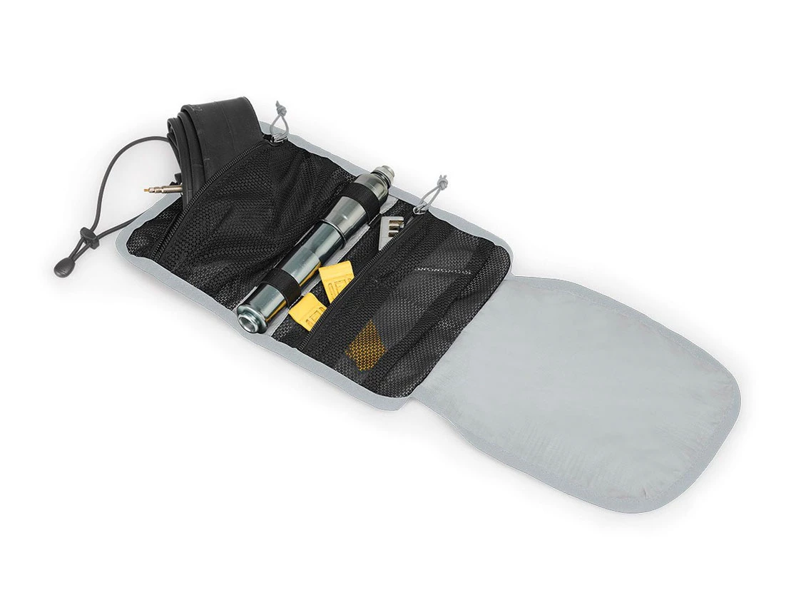 In an effort to keep things organized and protected, they’ve designed the Tool Roll. This handy roll-up pouch provides a secure place for every tool with zippered pockets for small and large items and a bungeed small-pump attachment. A nylon work area creates clean space on a dirty trail and doubles as a protective layer when everything’s rolled tight. Lightweight and durable, the tool roll is secured with a bungee cinch in transit, can be used in any pack, and is easily accessible at a moment’s notice.