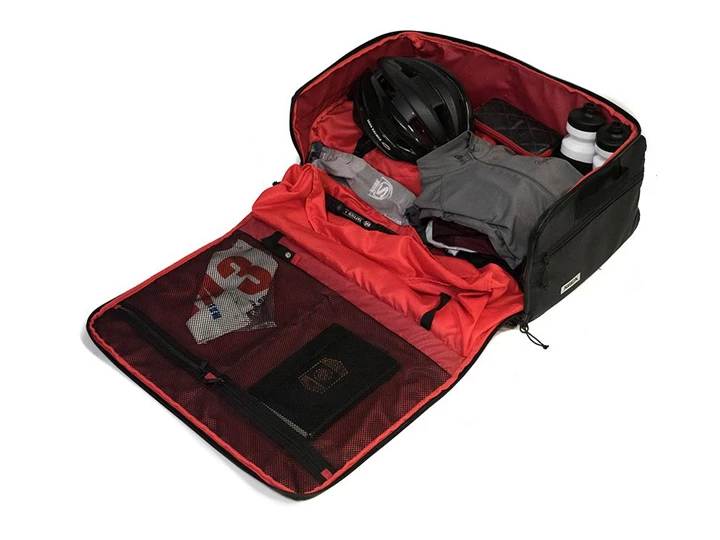 Key features include an internal vented shoe bag with both internal and external access, a vented damp garment bag and internal water bottle holsters. In addition to helping you stay organized, these features become even more useful after an event when you want to keep your ride-day kit separate from your other clothing and weekend essentials. Additionally, the padded top flap unzips completely so as to lay flat on the ground to form a small work area or act as place to sit while putting on shoes.