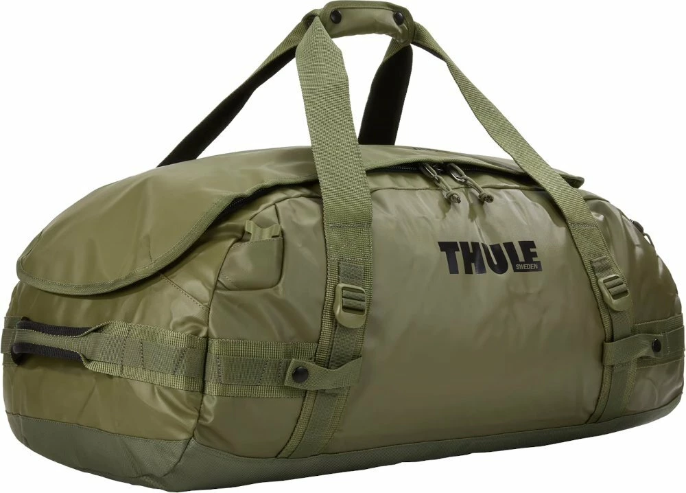 Thule Chasm 70L duffel bag is a rugged, weather-resistant bag that can be converted into a backpack with removable shoulder straps.