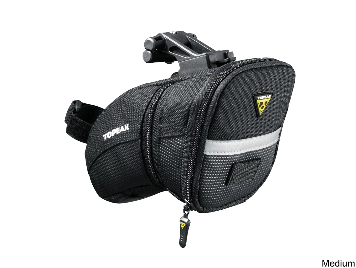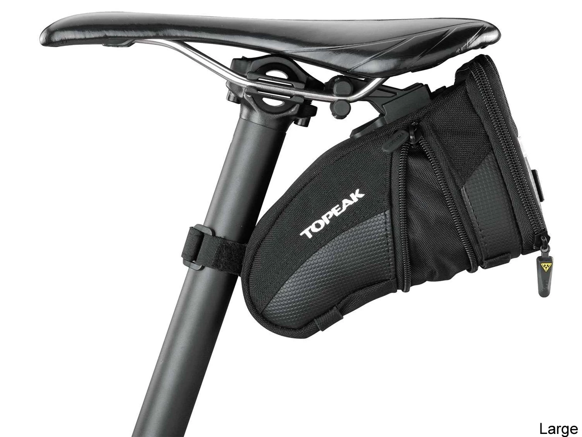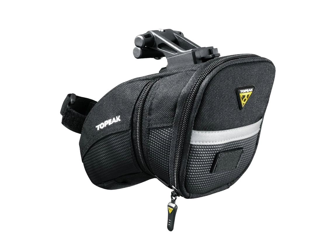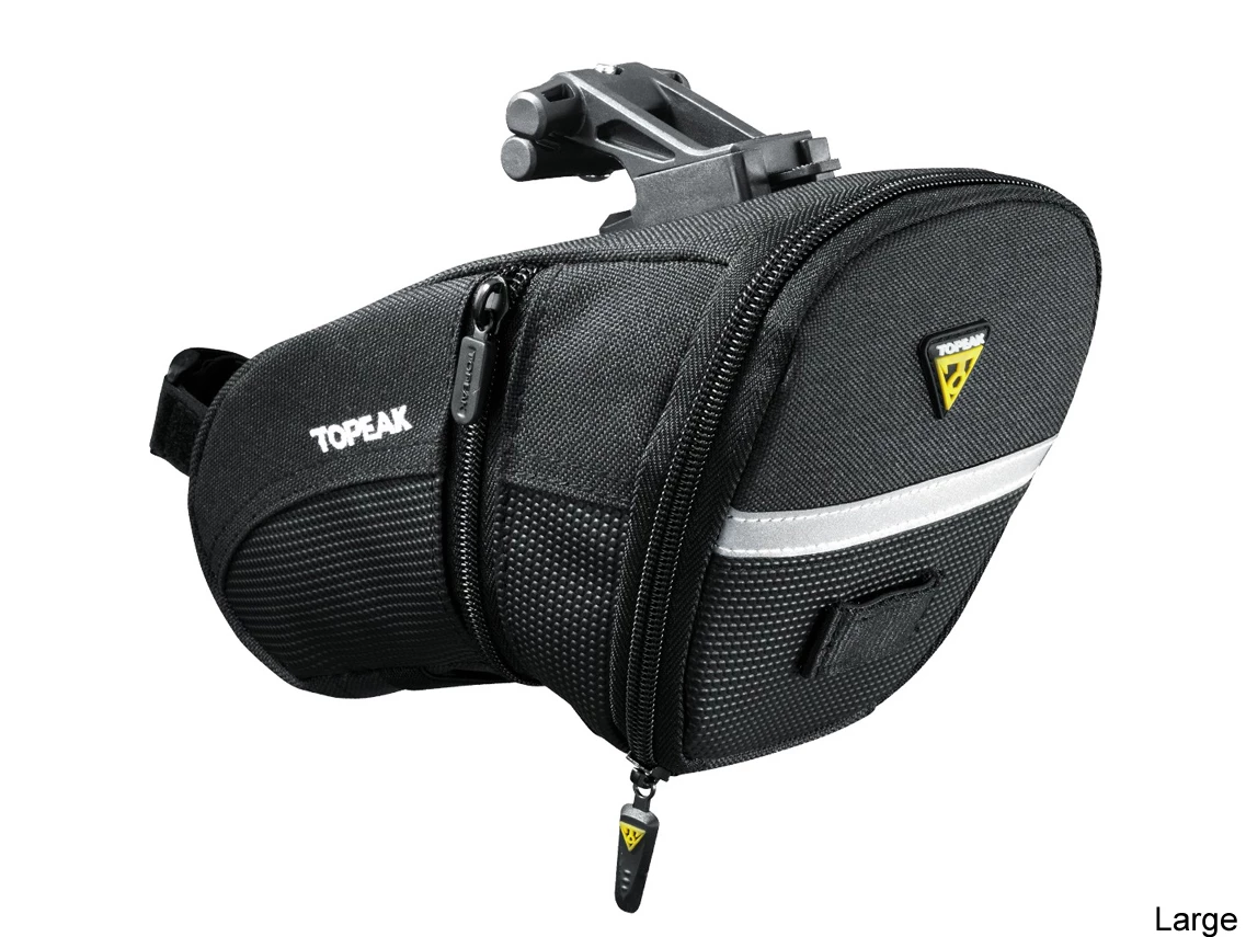 Aerodynamic seat bag holds tubes, tools and other repair items.