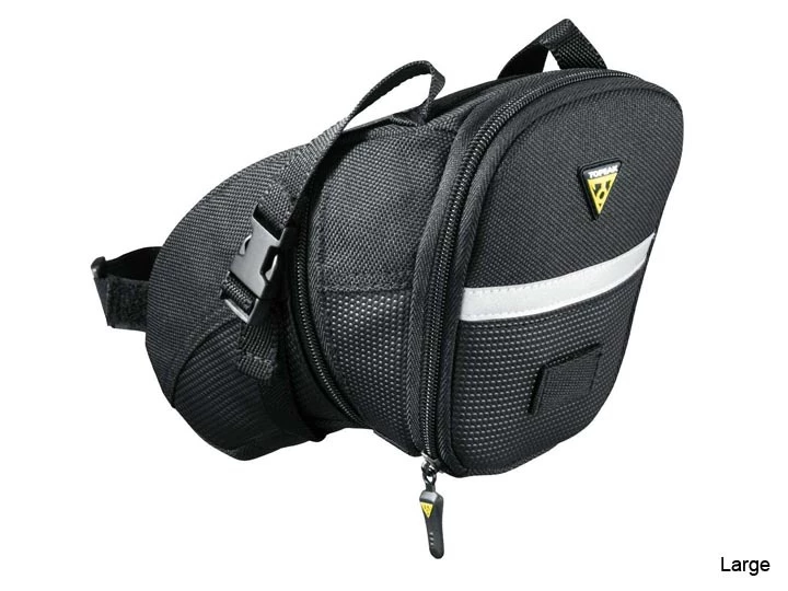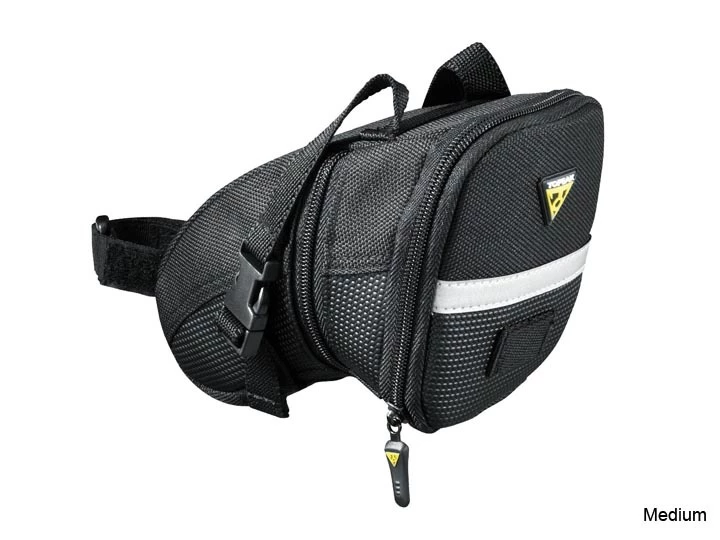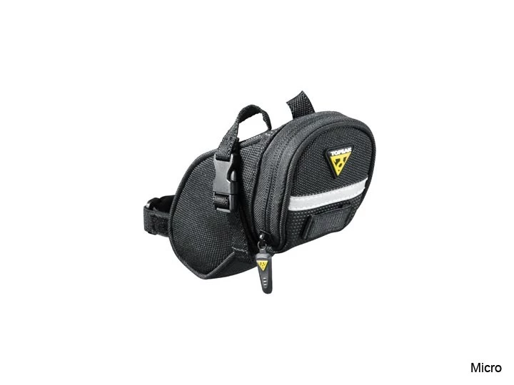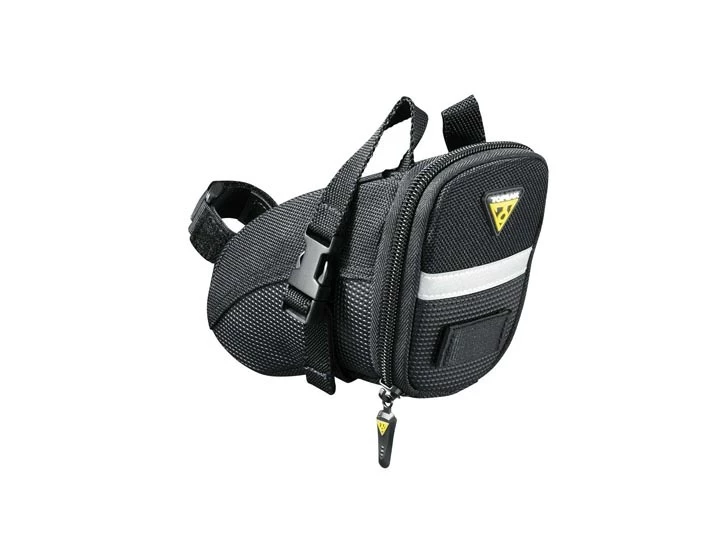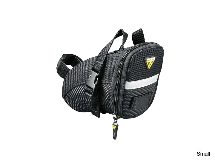Aerodynamic seat bag holds tubes, tools and other repair items.