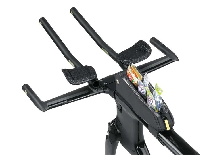 Mounts on triathlon frame top tube w/built-in water bottle bosses