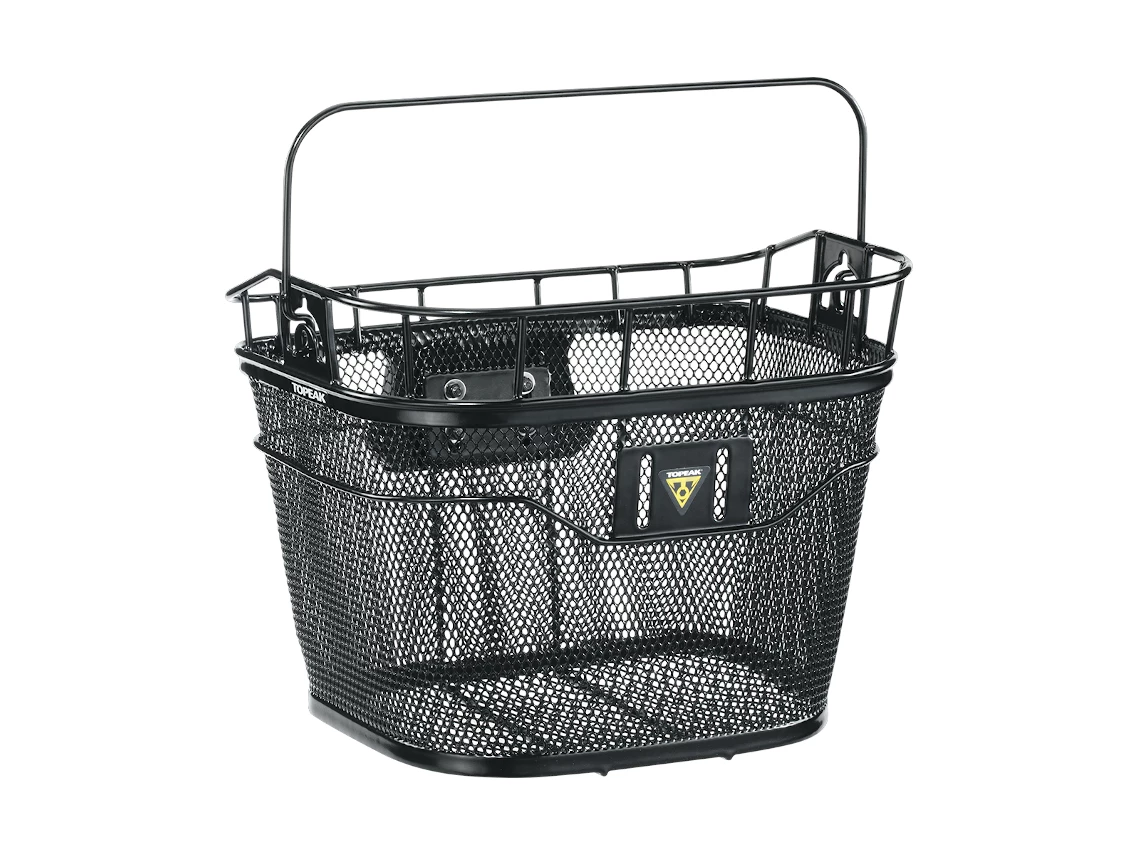 A sturdy handlebar-mounted metal basket for shopping trips, quick jaunts around town.