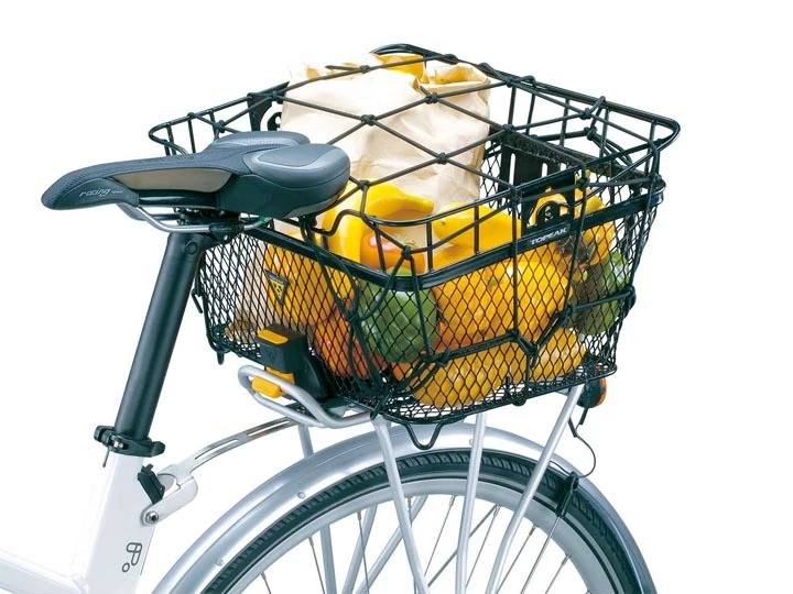 Metal basket mounts to rear rack with the MTX QuickTrack system.