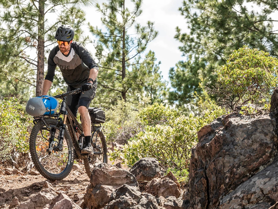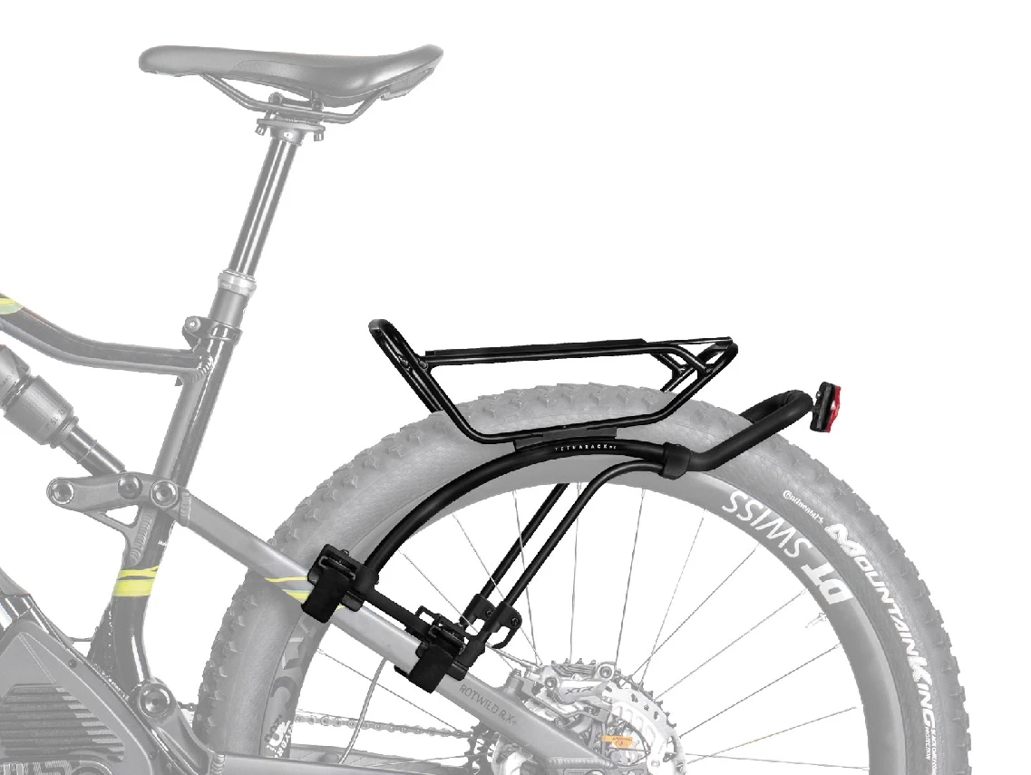 The perfect quick-mount rear rack system attaches to MTB full suspension seatstays or hardtail MTB without rack eyelets.
