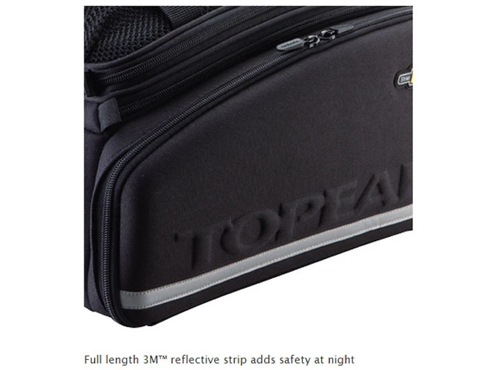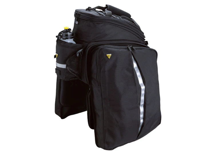 The divided main compartment features a two-stage expanding top plus side panels that zip open into full panniers for even more capacity. Compatible with all rear racks. Pannier deployment requires a beam rack with side frames attached or a traditional rack with struts to prevent panniers from contacting rear wheel.