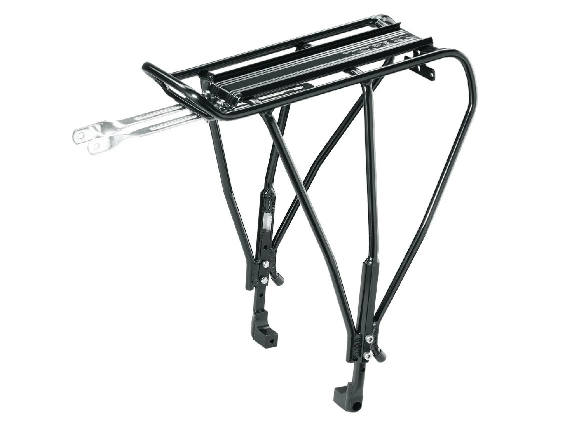 This one-size-fits-all aluminum tubular rear rack is equipped with adjustable legs to fit most 24” to 29” wheel MTB and 700C touring bikes with disc brakes. This tough tubular rack is perfect for touring, commuting, or running errands in town. The MTX QuickTrack plate is compatible with any Topeak MTX TrunkBag, MTX rear basket, and most other rack packs and panniers on the market.