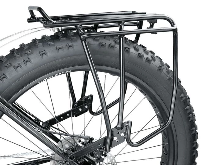The rack legs are adjustable to fit most 24” & 26” wheel Fat Bikes. The integrated side bar provides a lower pannier attachment point allowing more space for cargo on top of the rack. The MTX QuickTrack plate is compatible with any Topeak MTX TrunkBag, MTX rear basket, and most other rack packs and panniers on the market. Not compatible with asymmetric rearstay design fat bike frames.