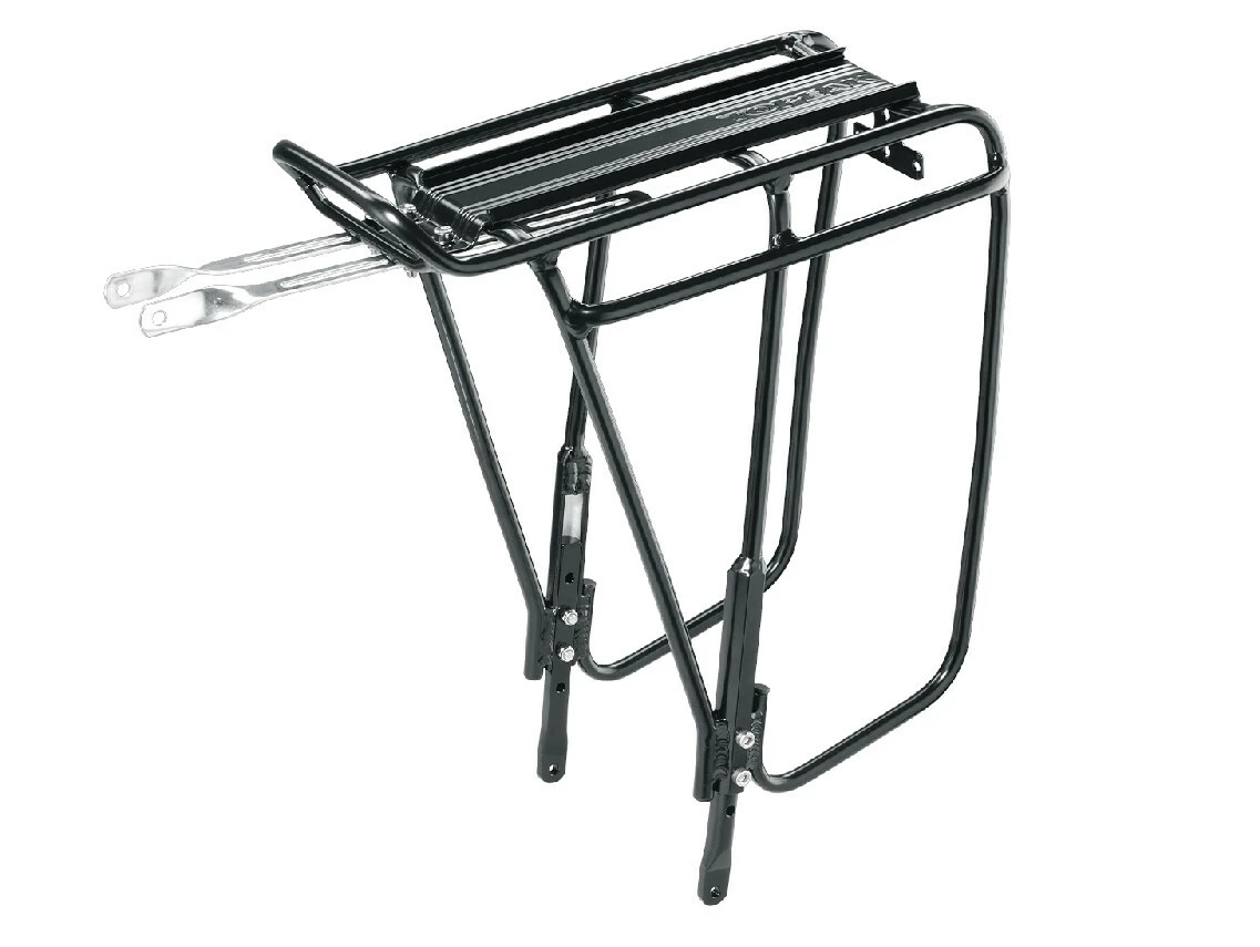 This one-size-fits-all aluminum tubular rear rack is equipped with adjustable legs to fit most 24” to 29” wheel MTB and 700C touring bikes. This tough tubular rack is designed for heavy-duty, long distance touring. The integrated side bar provides a lower pannier attachment point allowing more space for cargo on top of the rack. The MTX QuickTrack™ plate is compatible with any Topeak MTX TrunkBag, MTX rear basket, and most other rack packs and panniers on the market.