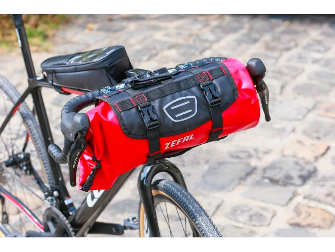 This universal handlebar bag is ideal for carrying light, large-sized items, such as a sleeping bag or a floor mat, in a way that evenly distributes the weight on the bicycle.